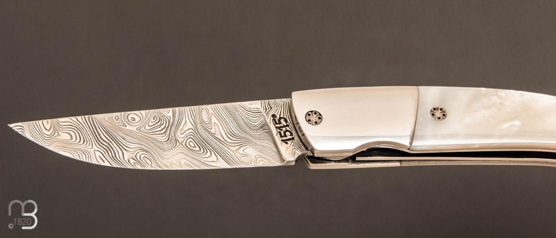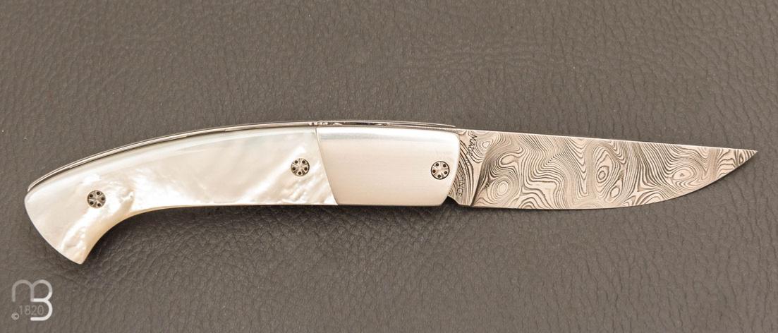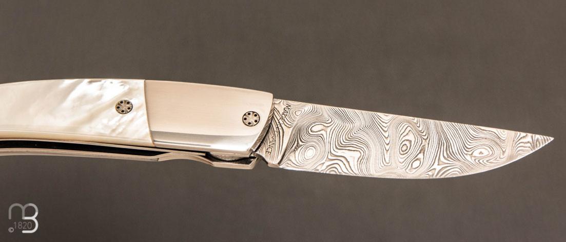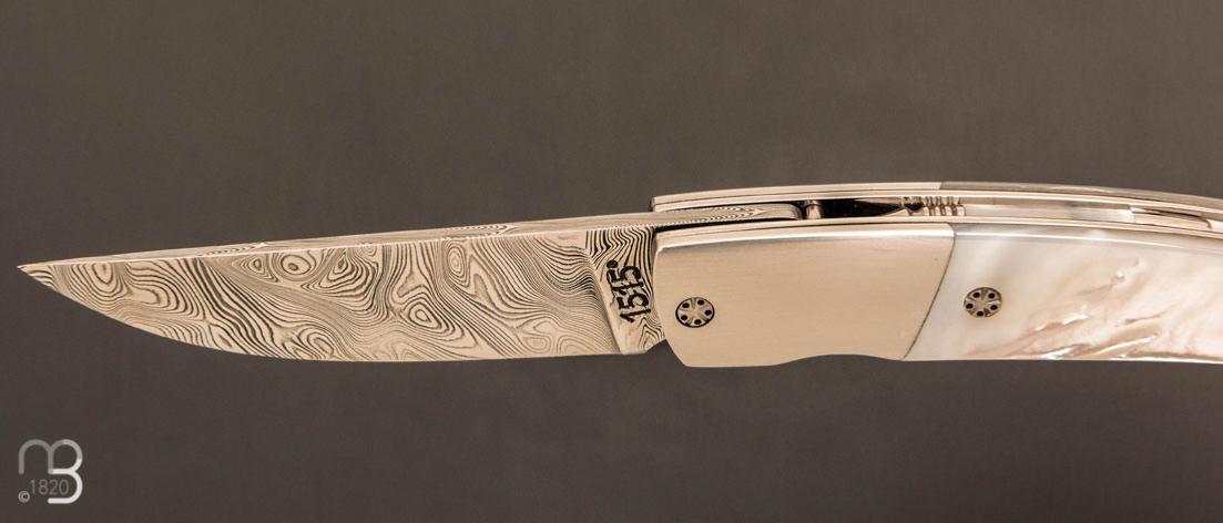 Couteau 1515 collection " 20 ans N°4/20 " par Manu Laplace - Nacre blanche et lame en damas inoxydable