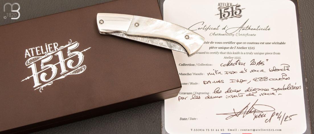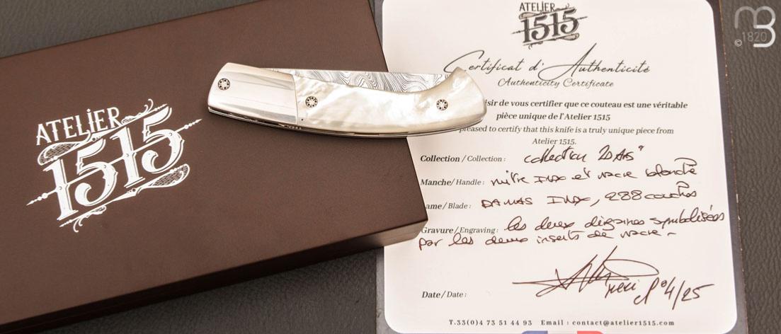 •  Couteau 1515 collection " 20 ans N°4/20 " par Manu Laplace - Nacre blanche et lame en damas inoxydable