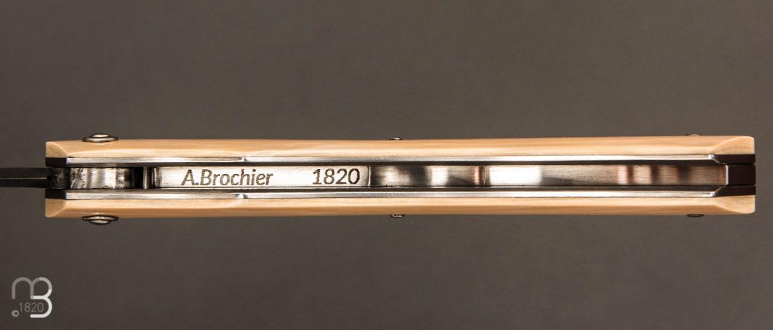 Couteau "1820 Berthier" d'exception réalisé par le coutelier Ardéchois Anthony Brochier, lame en damas Mosaïque forgée main et plaquettes en pulpe d'ivoire de mammouth, ajustage et mécanique parfaite ! Anthony nous le décline ici en version affinée par rapport à ses modèles précédents.