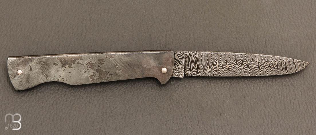 Nouveau modèle réalisé par le coutelier Ardéchois Anthony Brochier, lame en acier damas et manche en tôle pliée, ajustage et mécanique parfaite !