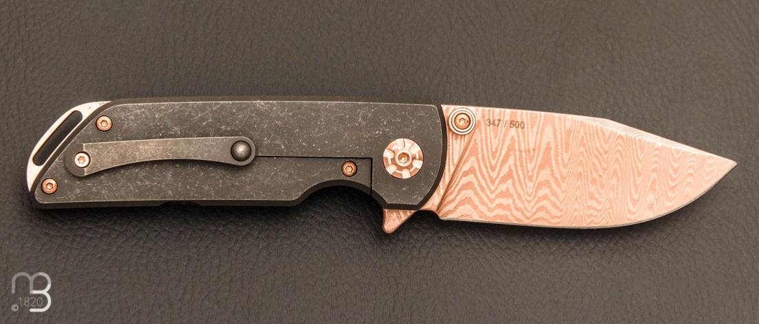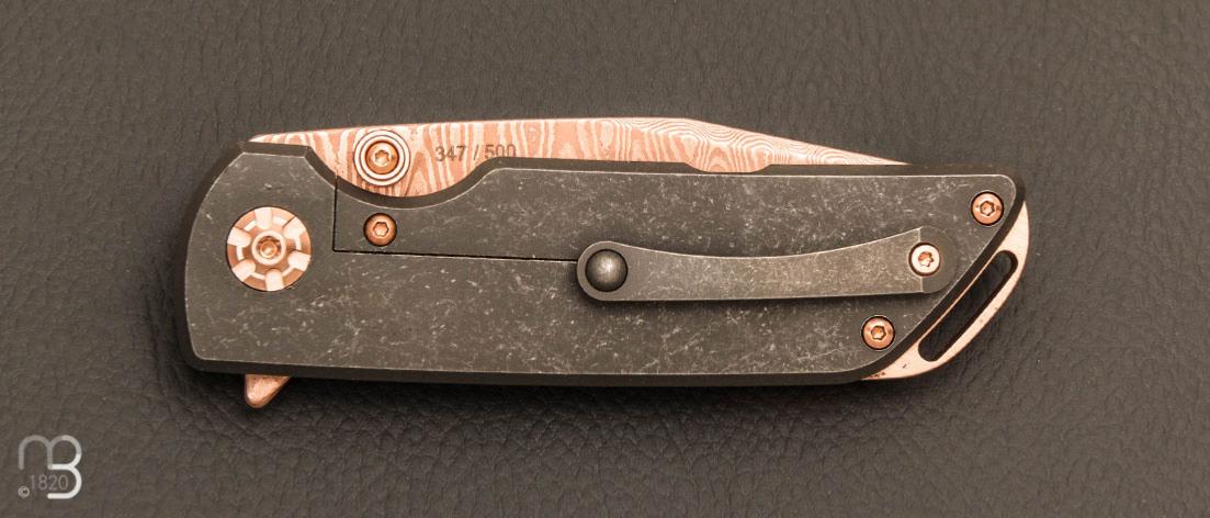 De plus, ce modèle est doté d'un revêtement en or rose sur la lame en damas, le clip ainsi que les vis, ce qui confère au couteau une finition particulièrement élégante.