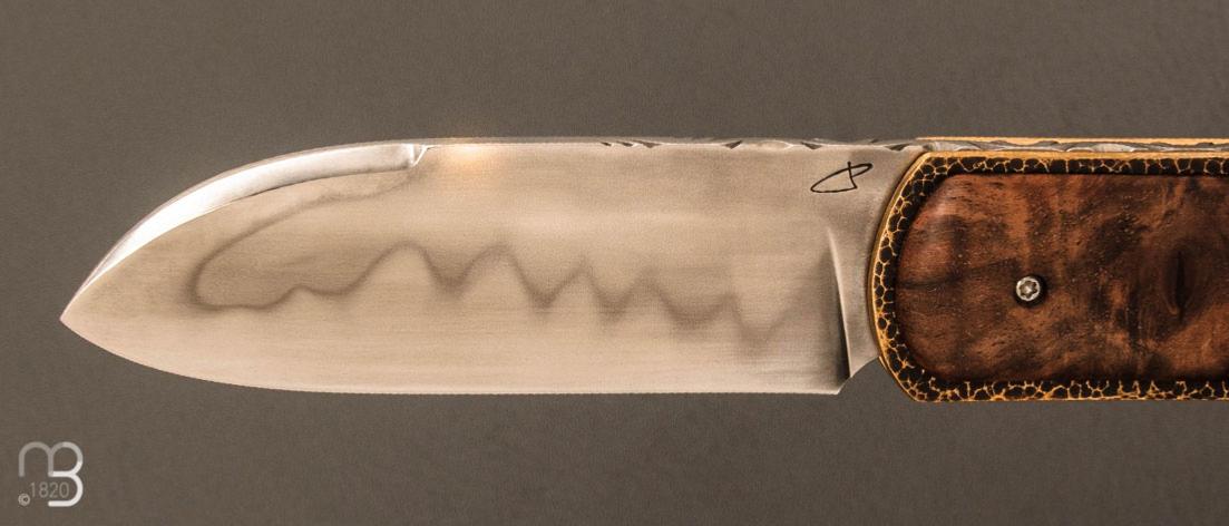 Couteau " Bouledogue " à cran carré de Sylvain Petit - Les Couteaux du Mitou - Loupe de noyer stabilisé et Sheffcut