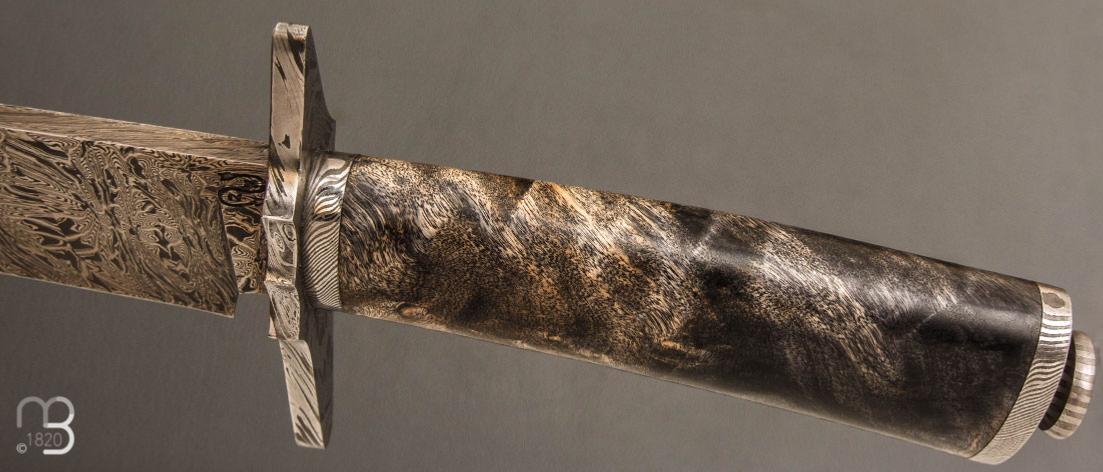 Un très beau couteau droit forgé de la main de Nicolas Mestrallet, avec une lame en acier Damas carbone et un manche en fourche de peuplier