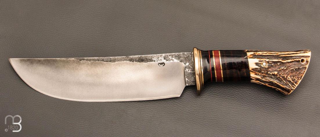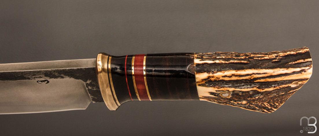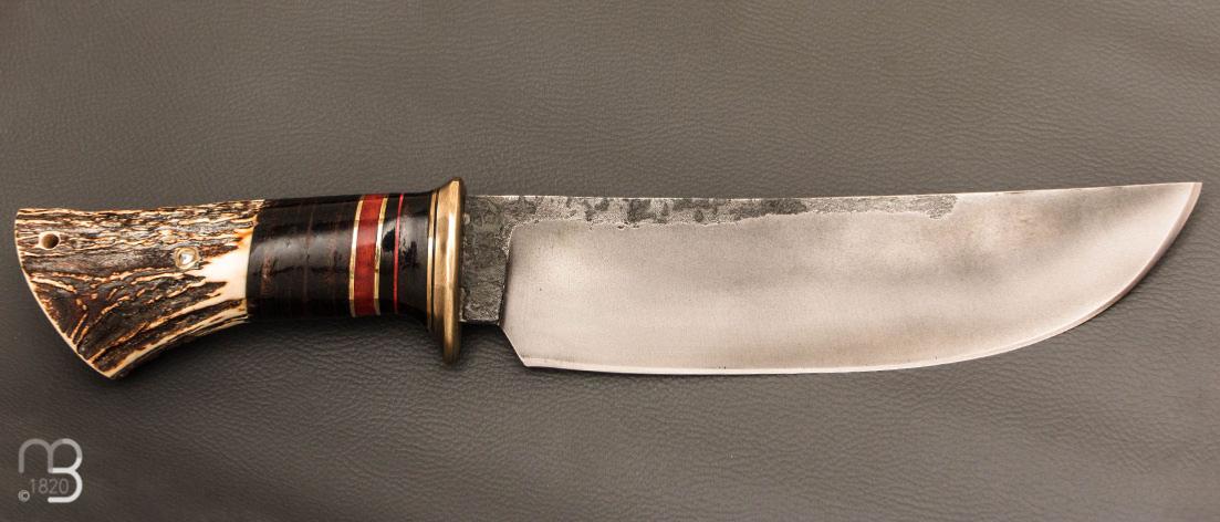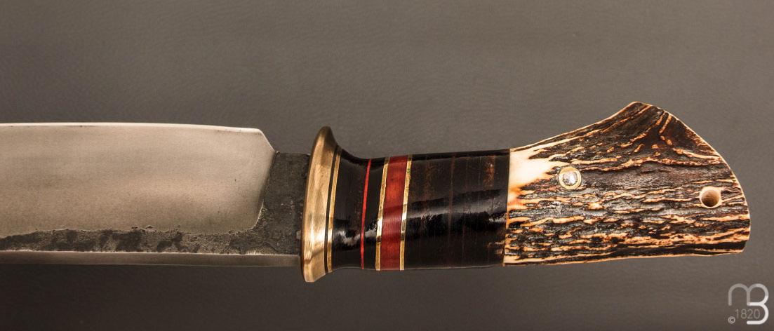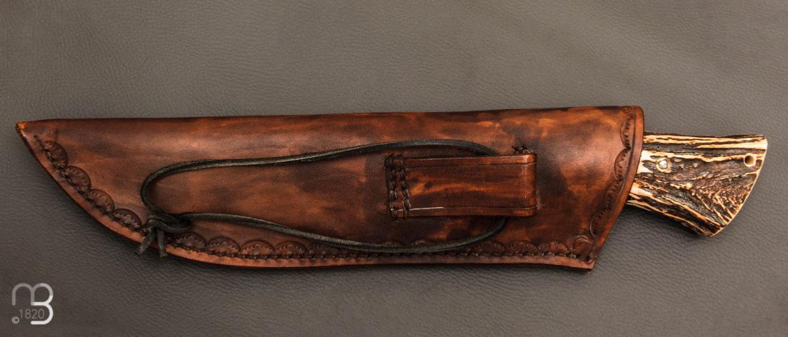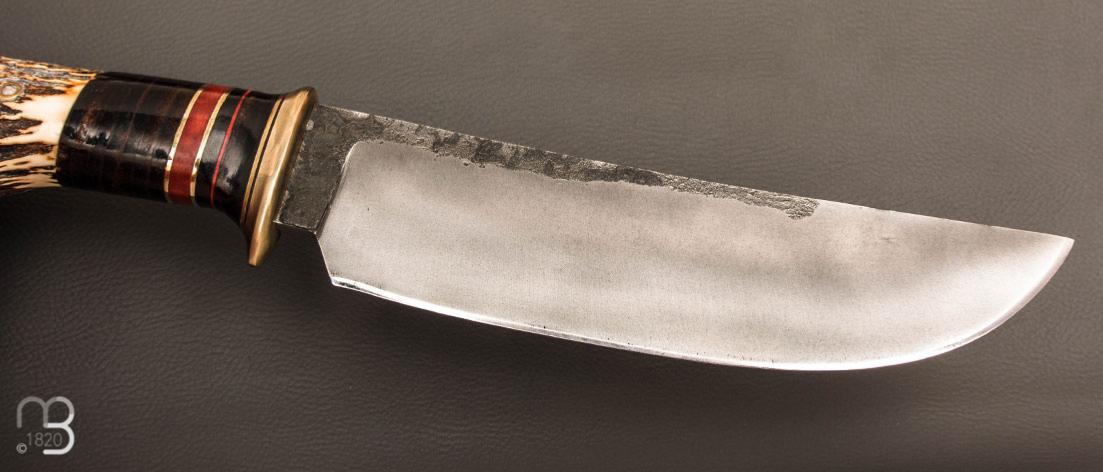 Couteau " Camp droit style Scagel " par Mickaël Moing - Rondelle de cuir / bois de cerf et lame forgée en acier 100C6