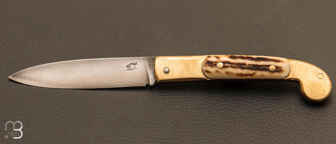•  Couteau custom de poche à cran carré de Pierre Henri Monnet - Laiton et bois de cerf