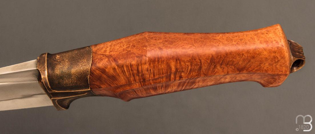 Un couteau fixe de Roman Stoklasa, avec un manche en racine de bruyère et une garde en bronze entièrement travaillés comme Roman sait si bien le faire.