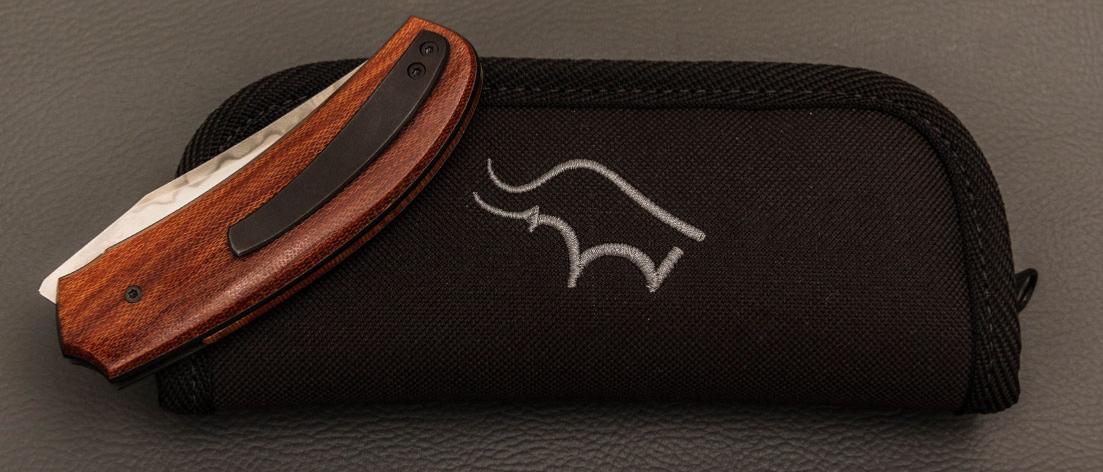 Plaquettes en micarta, montées sur platines en titane anodisé.