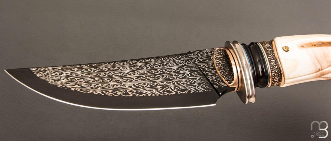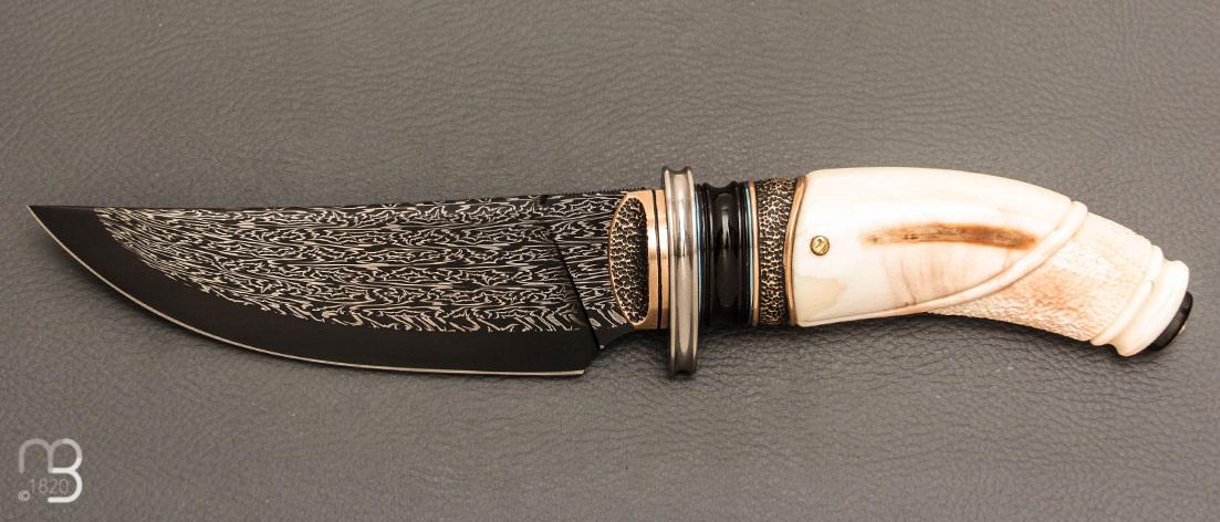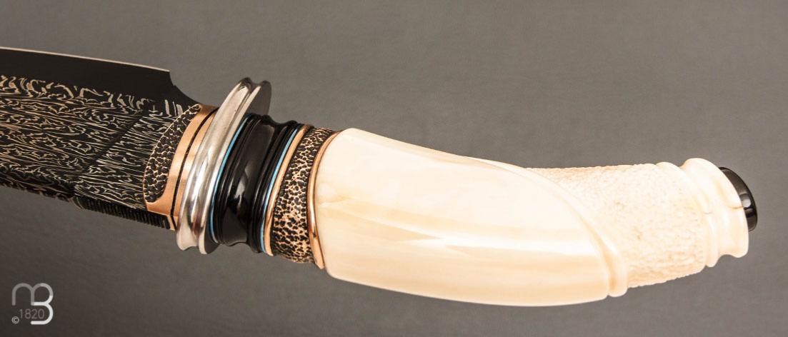 Couteau droit d'exception type "chasse" de Benoît Maguin, ce couteau est munit d'un manche en ivoire de phacochère, l'ergonomie et l'équilibre de ce couteaux sont excellents.