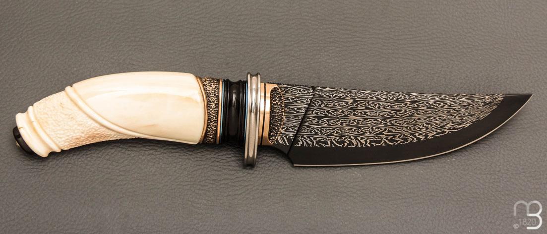 Couteau fixe custom avec un superbe manche en ivoire de phacochère et une lame damas multi-barreaux de Jean-Paul Sire.