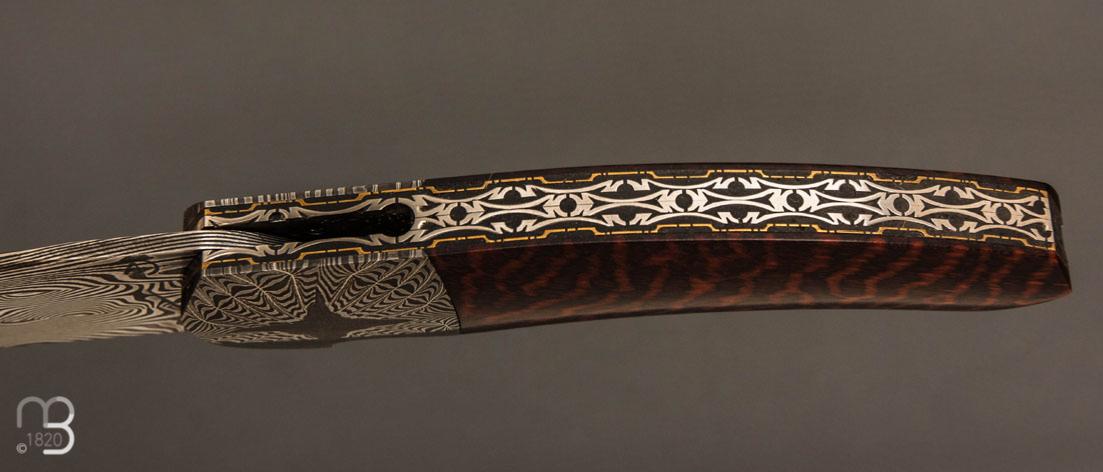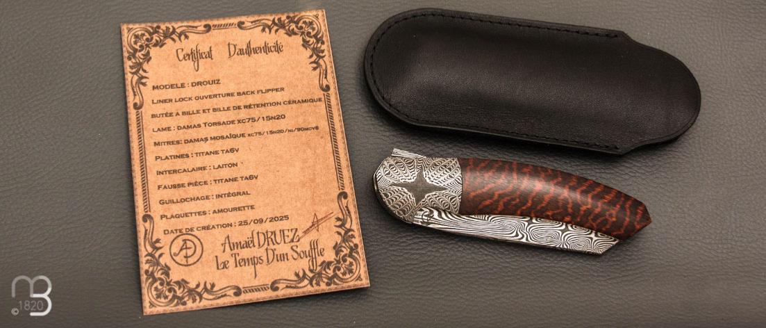 Un magnifique couteau d'Amaël Druez avec du damas et des plaquettes en amourette