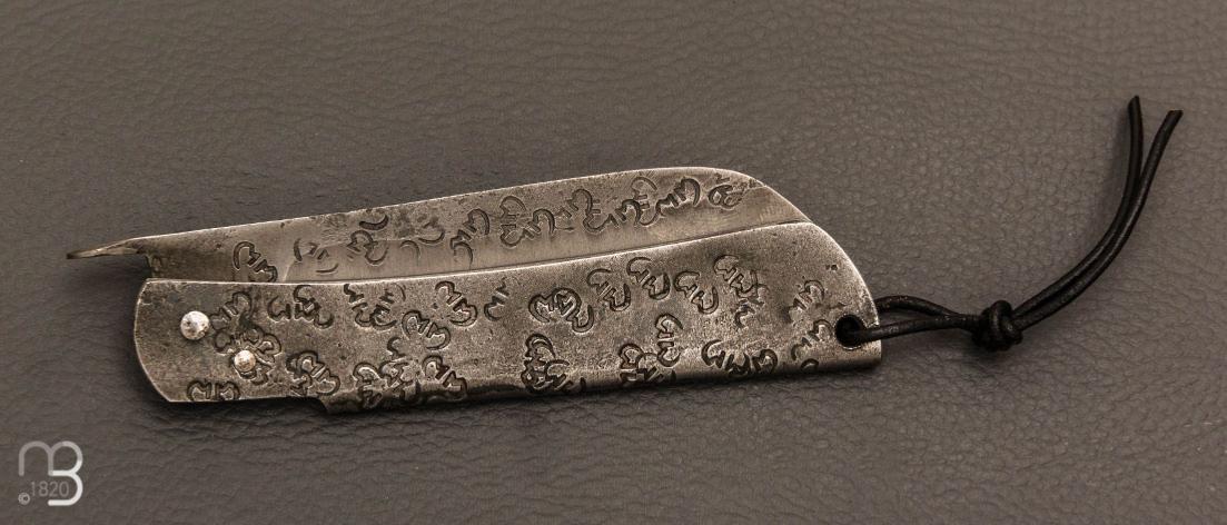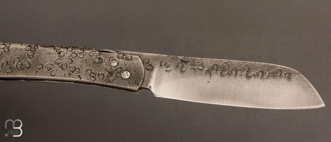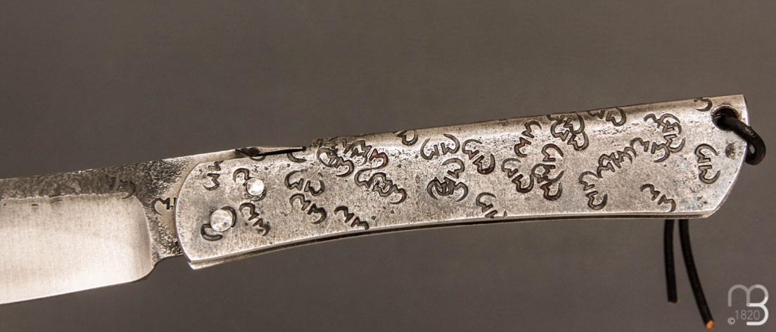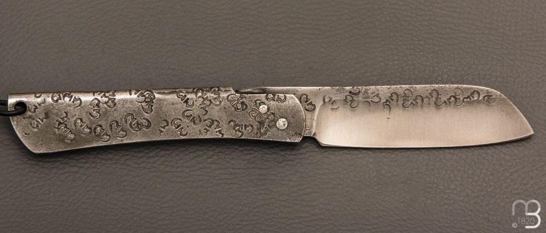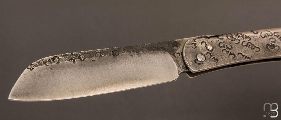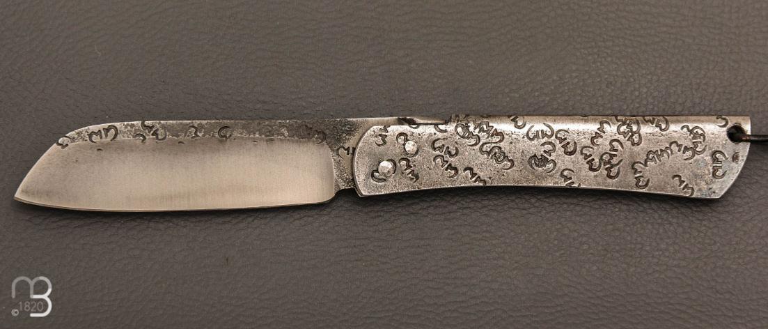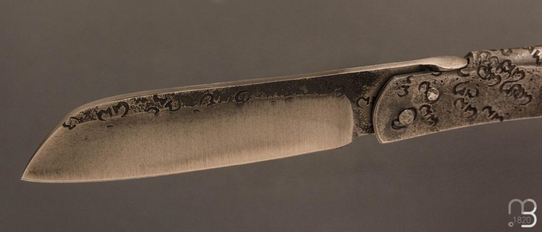 Couteau pliant piémontais avec lentille forgée "Higocentrique", fabriqué à la main par Mickaël Moing.