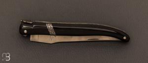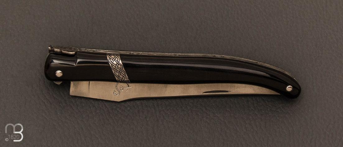 Couteau " Laguiole 12CM " corne noire et mitres centrales gravées par Benoît Salesses