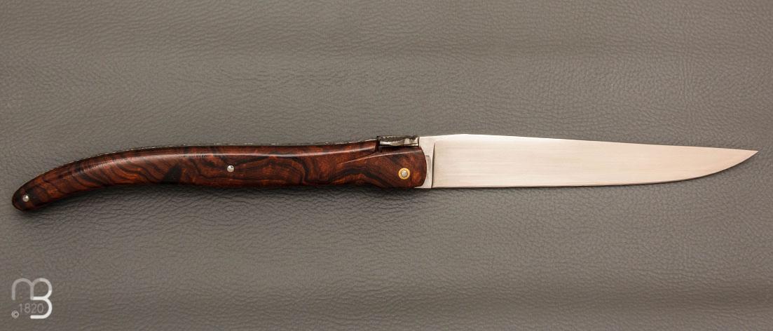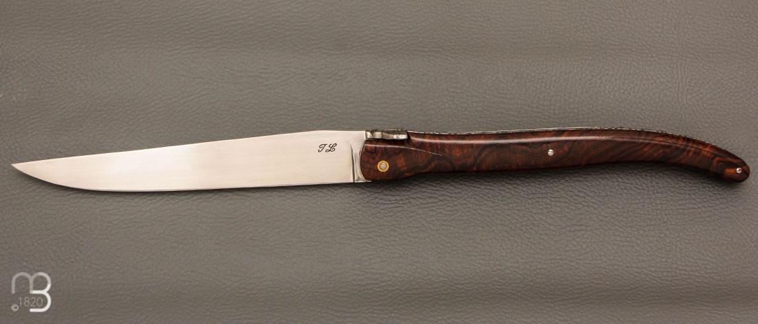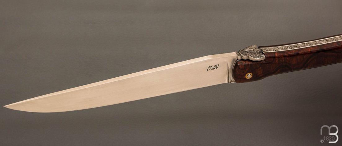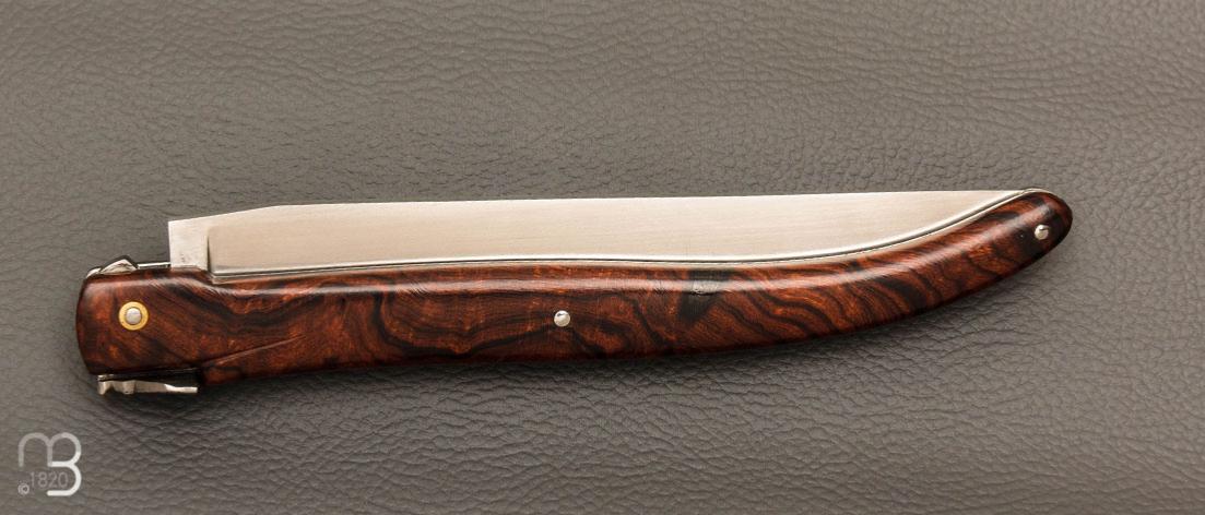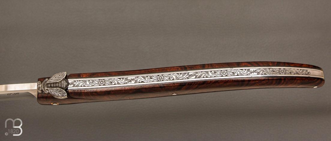 Couteau de poche de collection modèle "Laguiole" avec de jolies plaquettes en loupe de bois de fer et ressort entièrement gravé