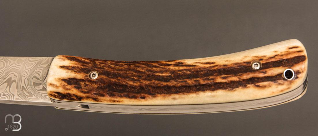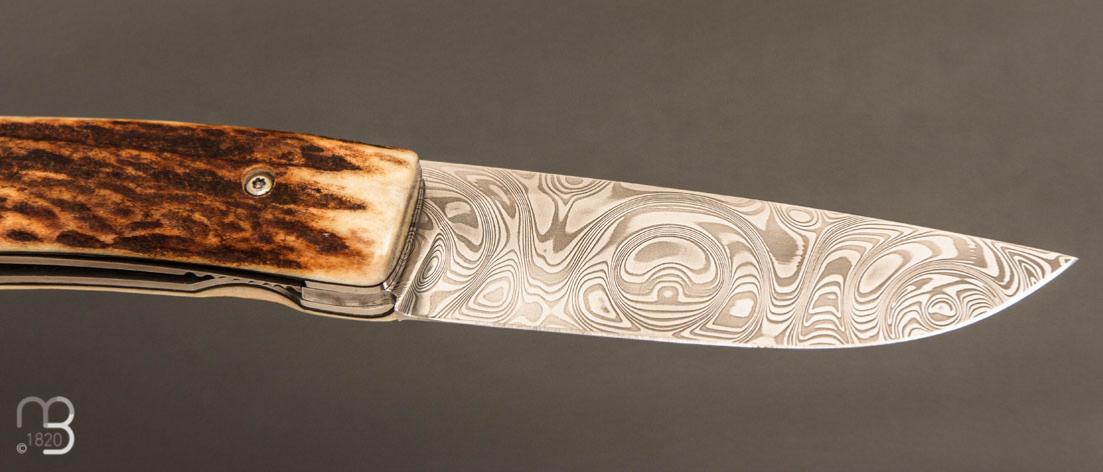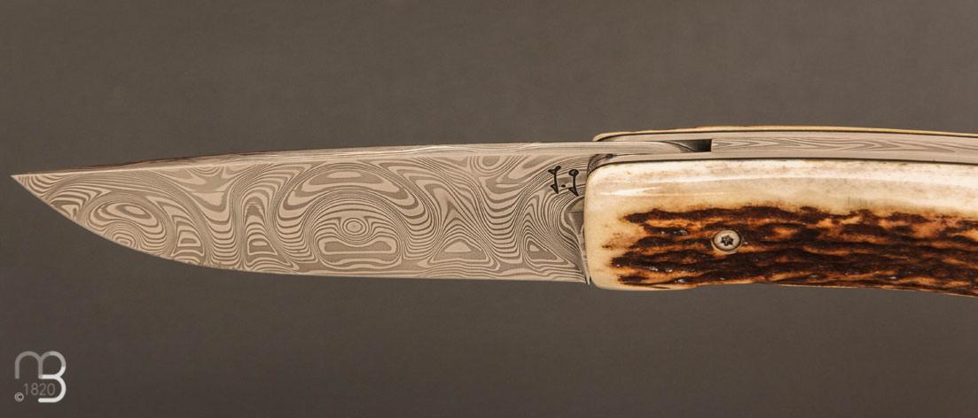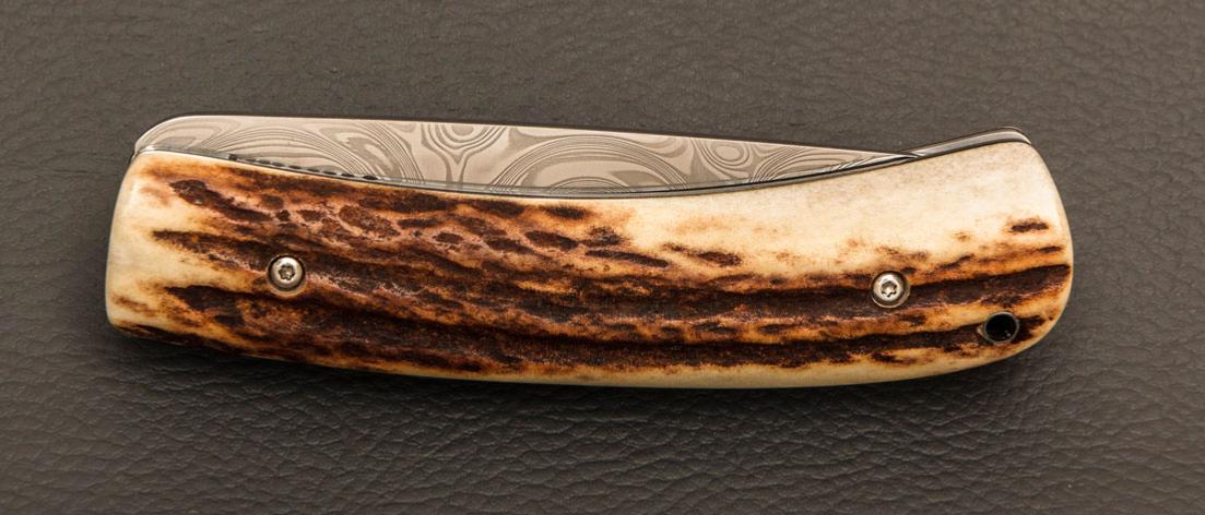 Couteau " liner lock " custom par Joël Grandjean - Bois de cerf et lame en damas