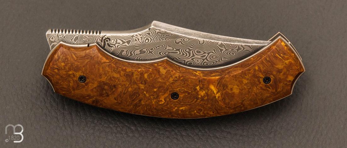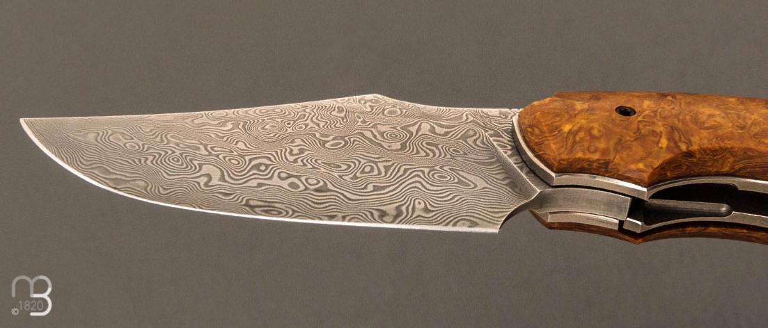 Couteau de collection entièrement réalisé à la main par le coutelier Rémi Bouin, avec une lame en acier damas inoxydable, modèle avec système liner-lock et front-flipper, d'une fluidité incroyable.