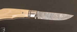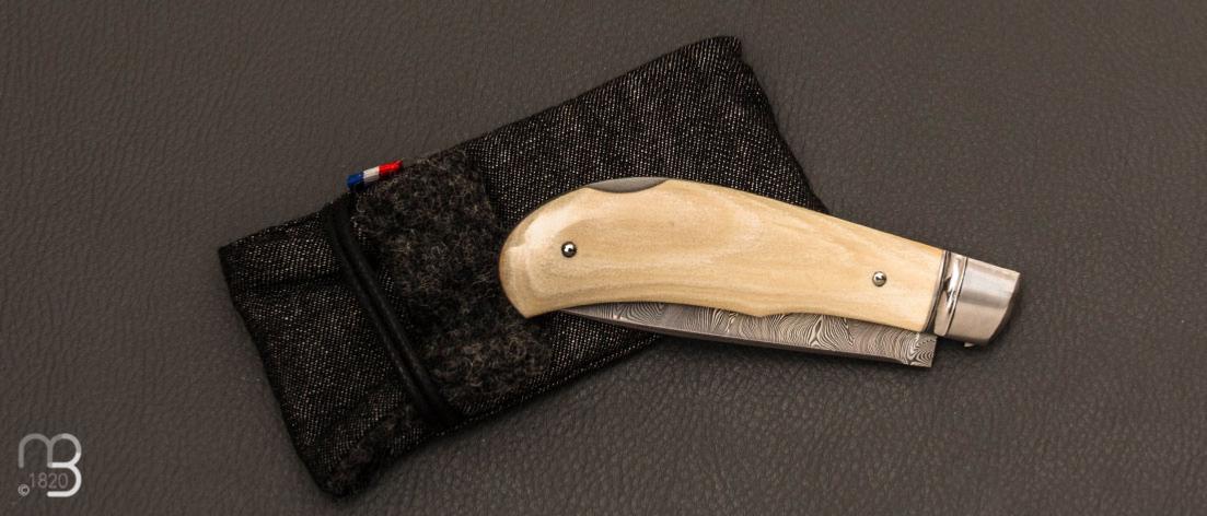 Un couteau de collection pliant à pompe arrière par Honoré Vilain, avec une lame en acier damas inoxydable Damasteel et un manche composé de plaquettes en ivoire de mammouth et des mitres en acier Z40.