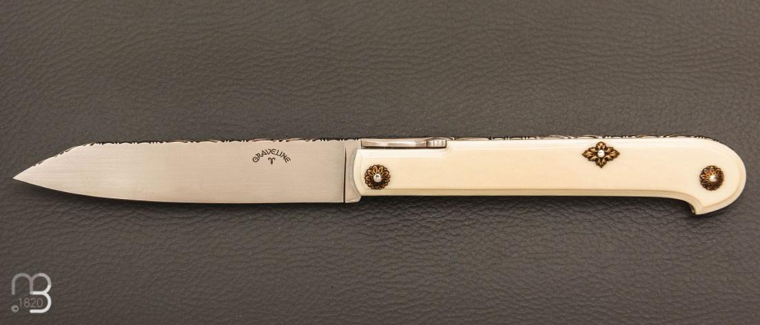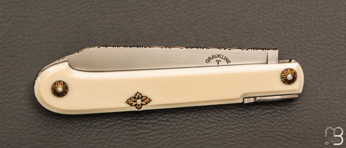Les couteaux de collection d'Isabelle et Pascal Graveline sont aussi rares que précieux. Nous avons eu la chance d'en trouver un à vous proposer. Une merveille de simplicité, dont le ressort et le dos de la lame ont été gravée par Bruno Casetto (Meilleur Ouvrier de France).
