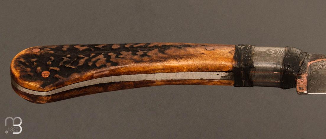 •  Couteau  "  Primitif " droit forgé par Pierre Henri Monnet - Bois de cerf et damas carbone