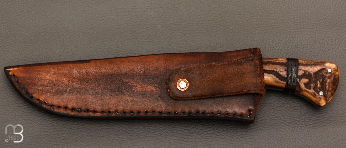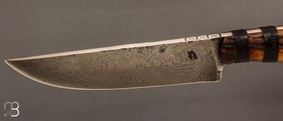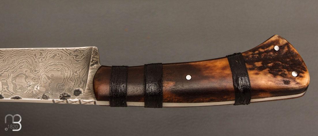 Couteau " Primitif " droit forgé par Pierre Henri Monnet - Bois de cerf et damas carbone