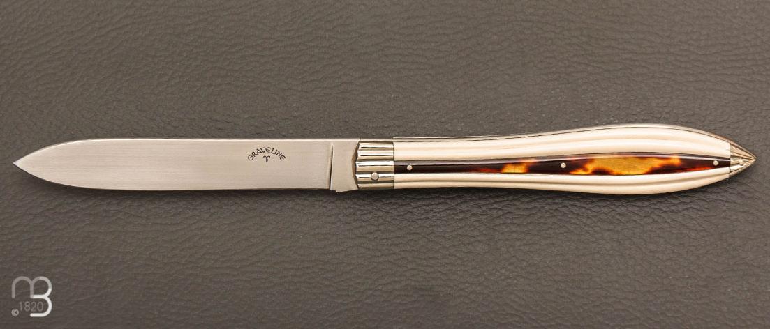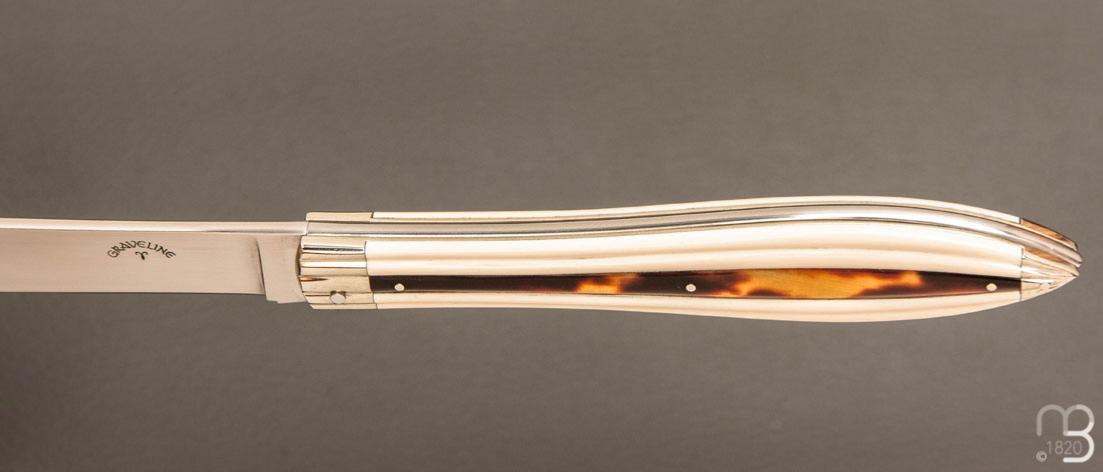 Les couteaux de collection d'Isabelle et Pascal Graveline sont aussi rares que précieux. Nous avons eu la chance d'en trouver un à vous proposer. Nous vous proposons ici le modèle Sarah B d'inspiration Art Nouveau. Un modèle élégant, sobre et raffiné en hommage à Sara Bernhardt.