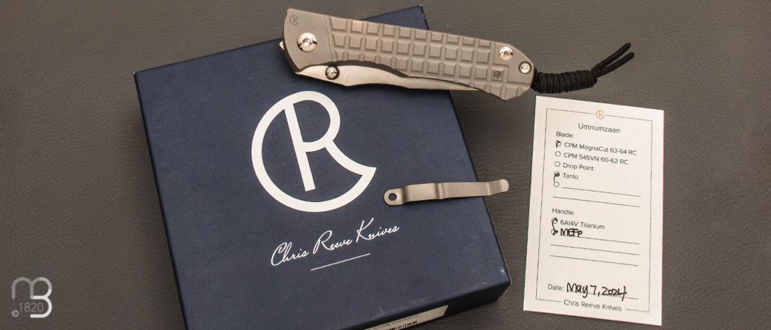 Ce couteau de Chris Reeve Knives est livré dans sa boîte d'origine complète (lubrifiant, outils, microfibres, papiers datés du 07 Mai 2024, ainsi que le clip d'origine)