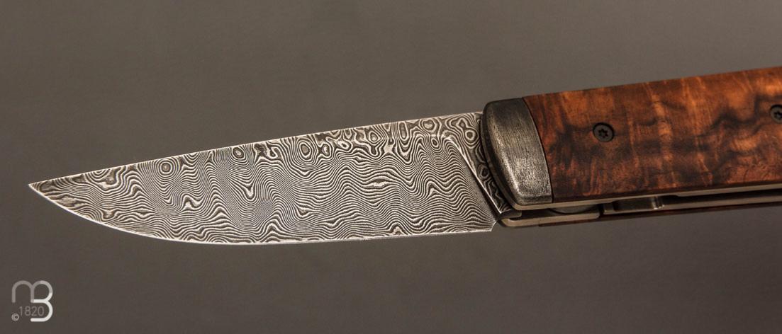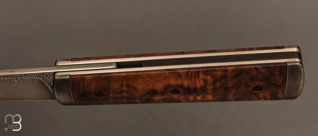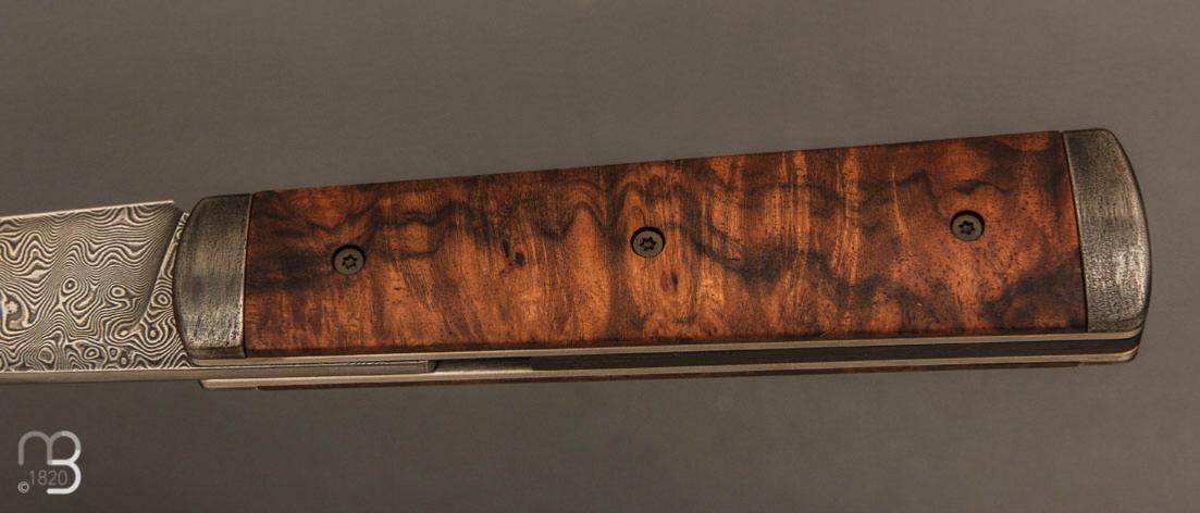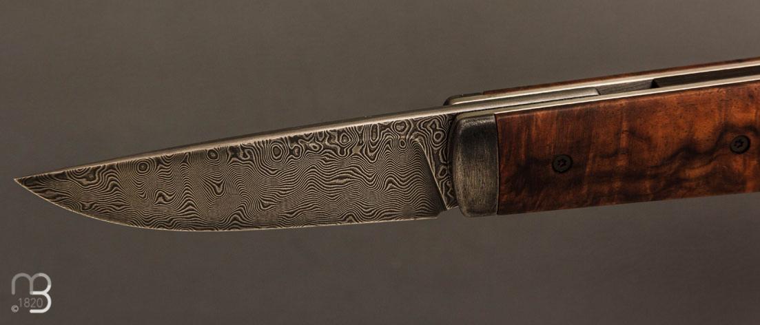 Couteau pliant type puukko forgé avec de jolies plaquettes en loupe de noyer