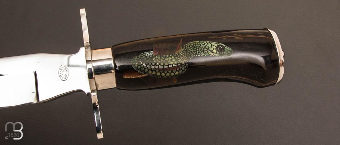 Une dague de chasse avec manche en corne noire massive et un superbe scrimshaw couleurs de Jean-Pierre Coudert , garde et culot en acier inoxydable par Jacques MONGIN.