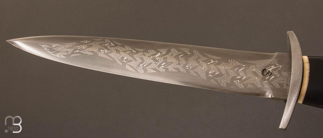 Ici le coutelier forgeron Drômois a réalisé cette dague avec une garde en damas, un manche en ébène avec intercalaire en ivoire de mammouth et une lame à double tranchants, forgée main en acier damas explosion (90MCV8/15N20) avec tranchant rapporté en 90mcv8.