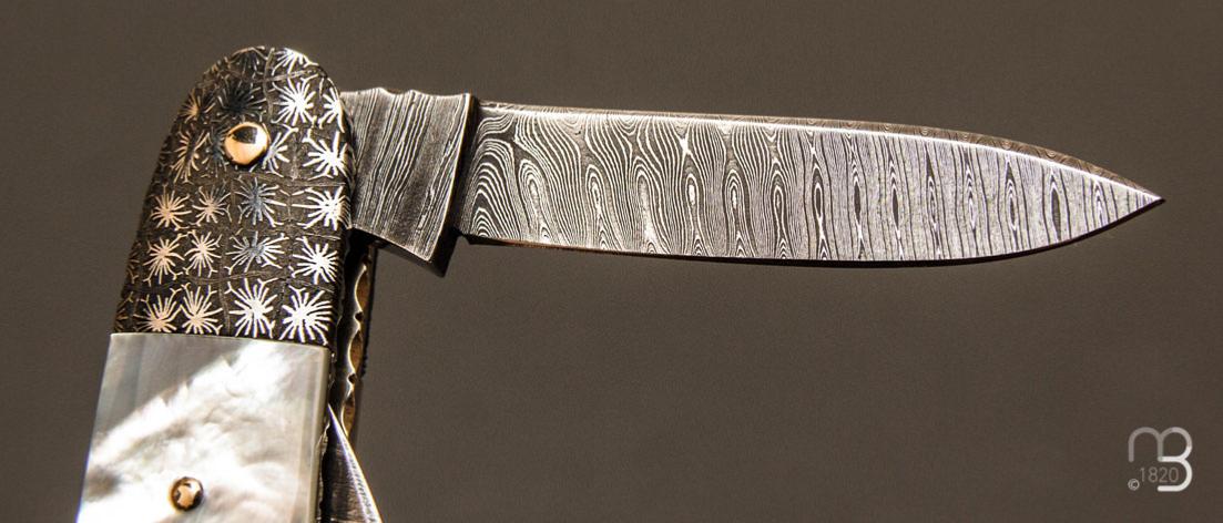 Manche avec mitres damas forgé par l'artisan, et plaquettes en nacre blanche.
