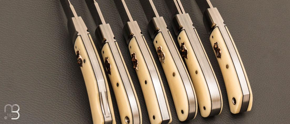 Les manches sont composés de plaquettes en micarta blanc avec écusson en bois de cerf.