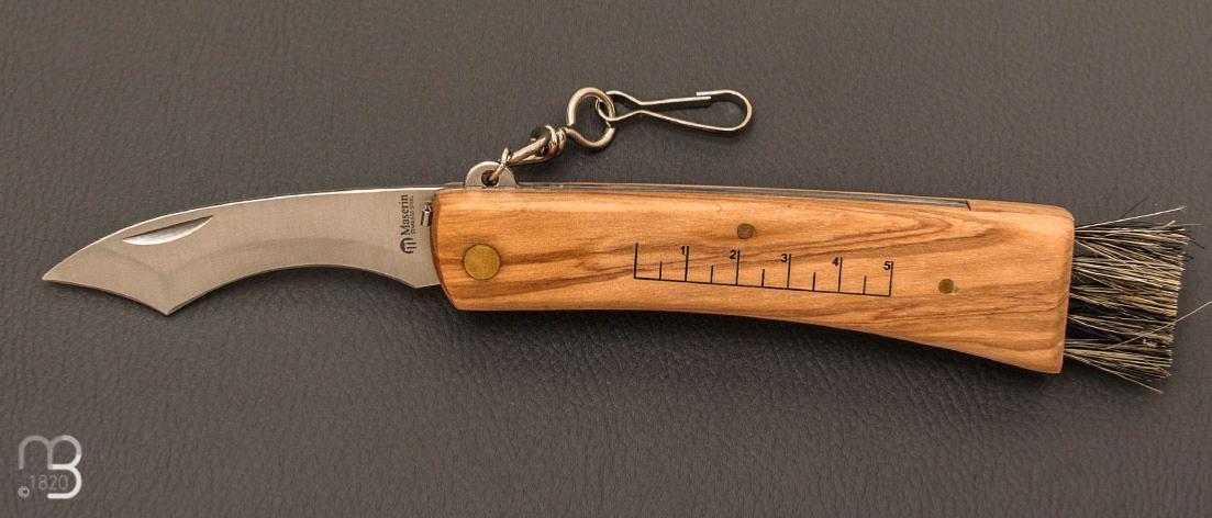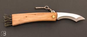 Couteau pliant à champignons Maserin, manche en olivier longueur 120 mm, lame spéciale inox, avec brosse en bout et pincettes.