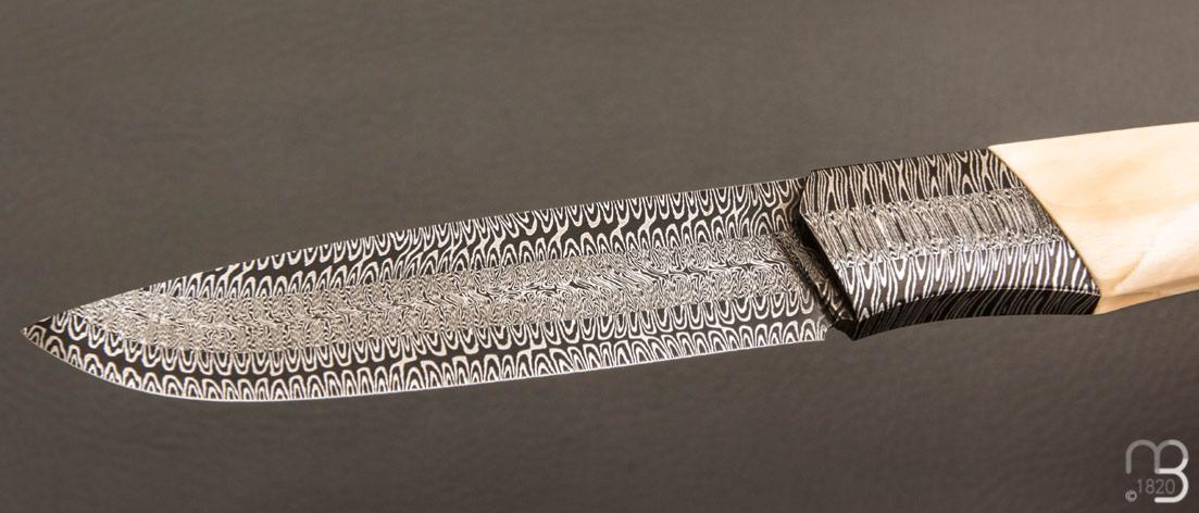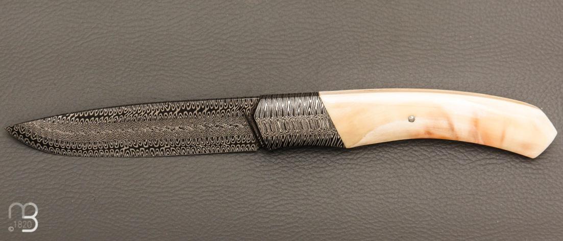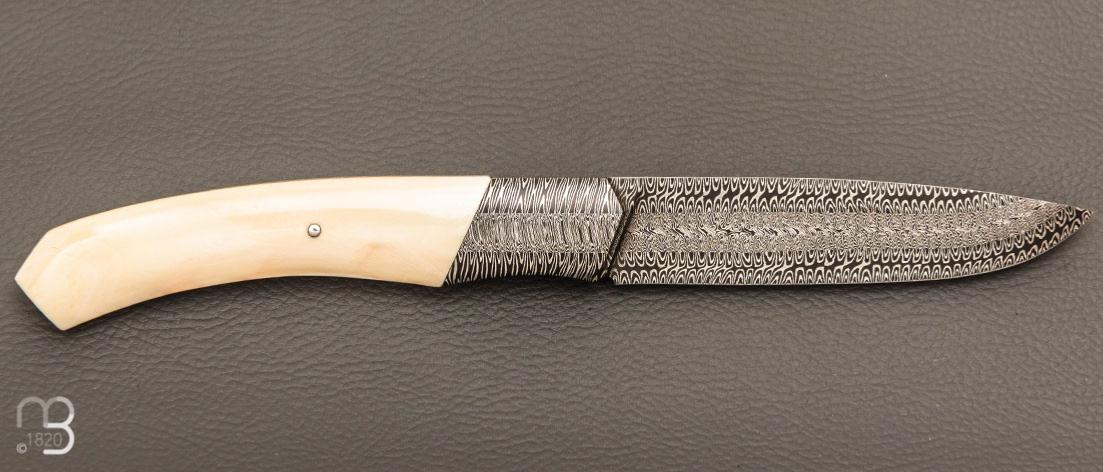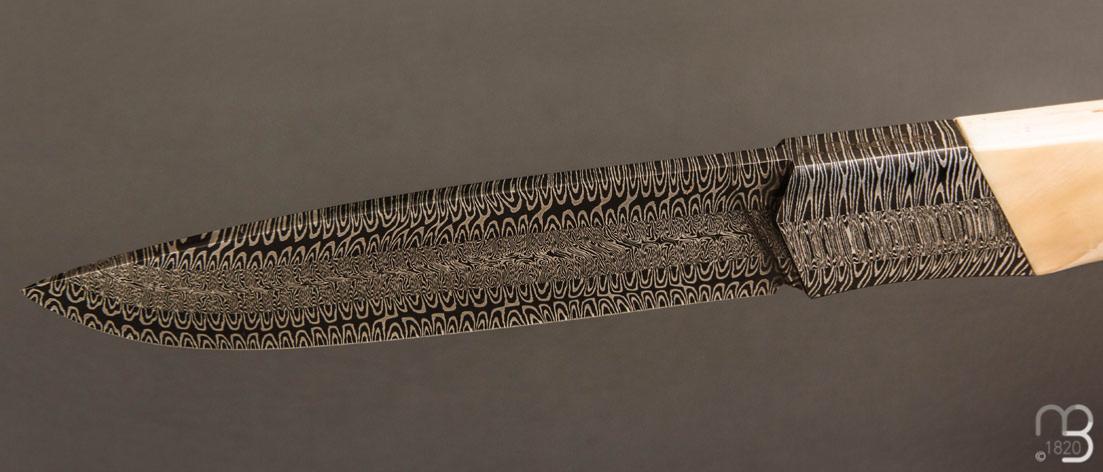 Couteau "1820 Berthier" d'exception réalisé par le coutelier Ardéchois Anthony Brochier, lame en damas multi-barreaux forgée main et poignée en ivoire de phacochère, ajustage parfait !