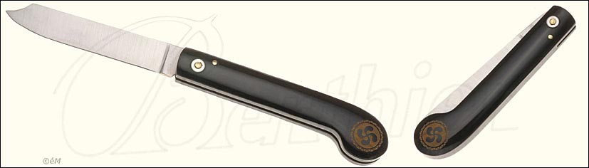 Couteau de poche pliant régional basque Adour, création Christophe Lauduique, système ouverture 2 clous, longueur ouvert 220 mm, longueur fermé 120 mm, plein manche en corne buffle noire, gravée sur manche stèle discoïdale emblématique du pays basque avec croix basque Le Lauburu, lame acier inoxydable 12C27 finition polissage satiné. L'Adour, rivière et fleuve du sud-ouest de la France, naissant au col du Tourmalet, dans les Hautes-Pyrénées, traverse le Gers, les Landes et se jette dans l'Atlantique à Bayonne-Anglet.