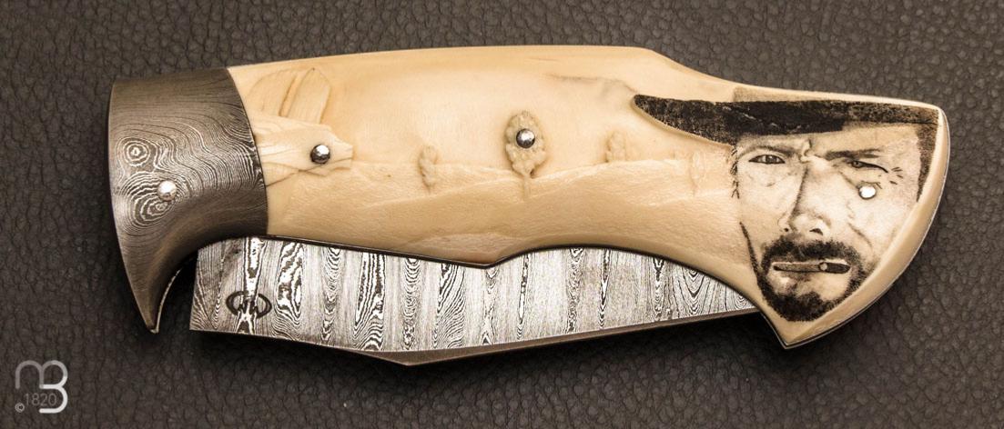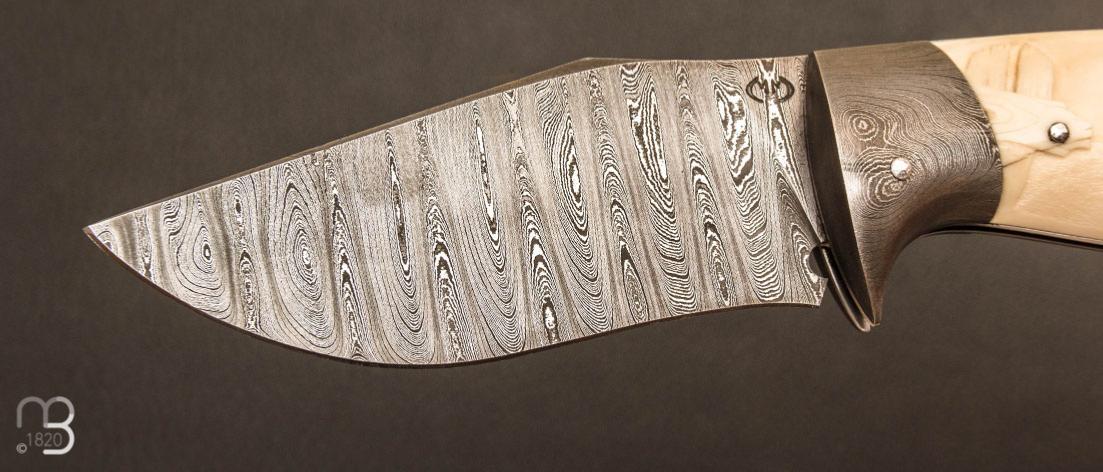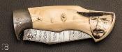 Couteau de poche modèle "Big Harry" - Cran forcé - plaquettes en ivoire de phacochère gravé - mitres en damas et lame en damas de Sam Lurquin