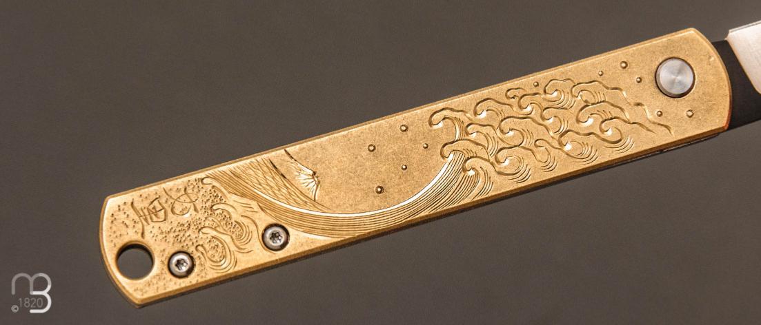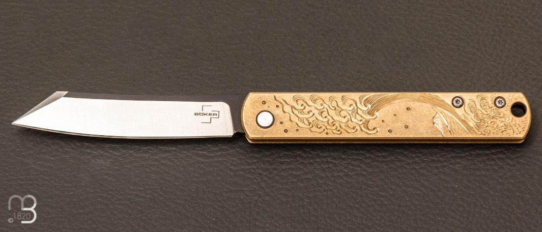 Couteau Böker Plus Zenshin 42 Laiton gravé par Mali Irie motif "Vague et Fujiyama"