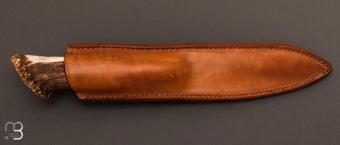 Couteau chasse bois de cerf et lame forgée par Jean Paul SIRE + étui cuir