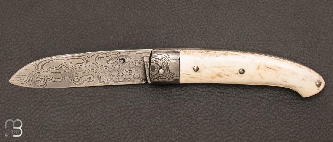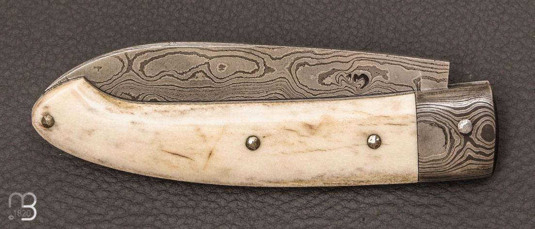 Couteau "  Cran forcé  " damas et bois de cerf par Mickaël Moing