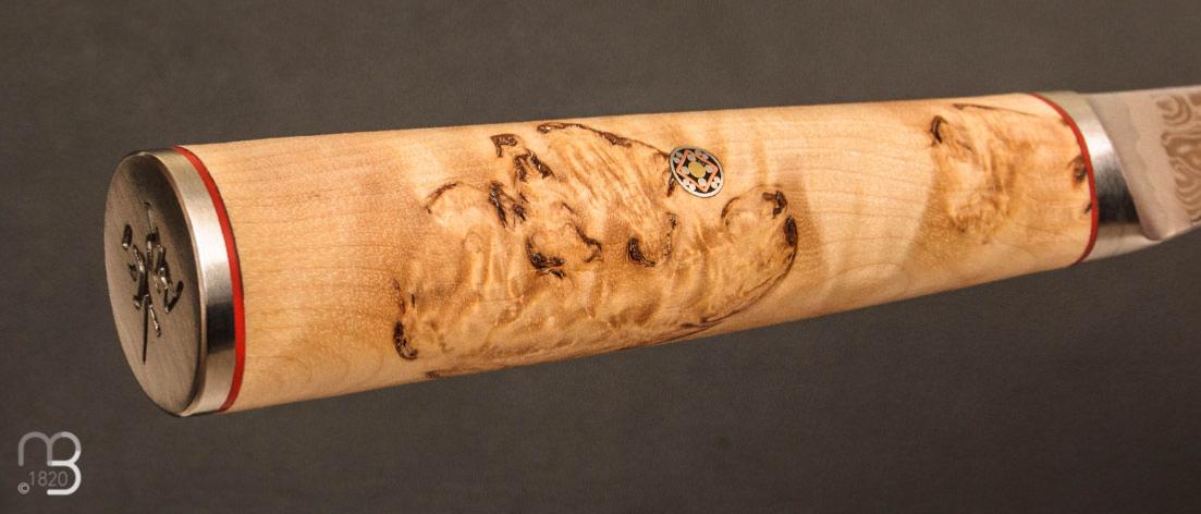 Ce couteau a une lame de 24 cm en acier SG2 damas, et un manche en bouleau madré.