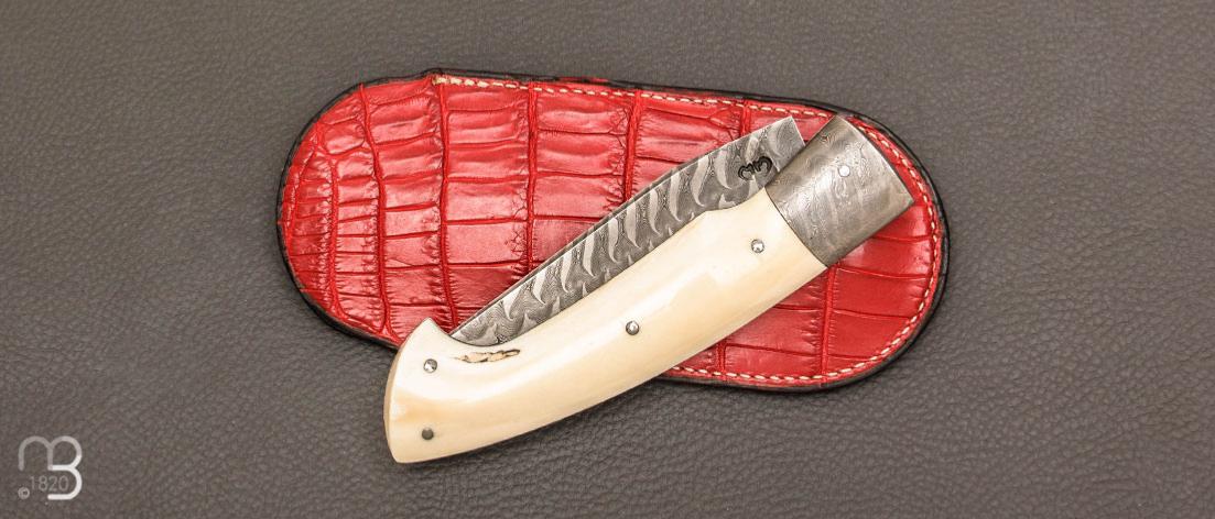 Couteau " Danny XL " Cran forcé ivoire de phacochère et lame damas par Mickaël Moing