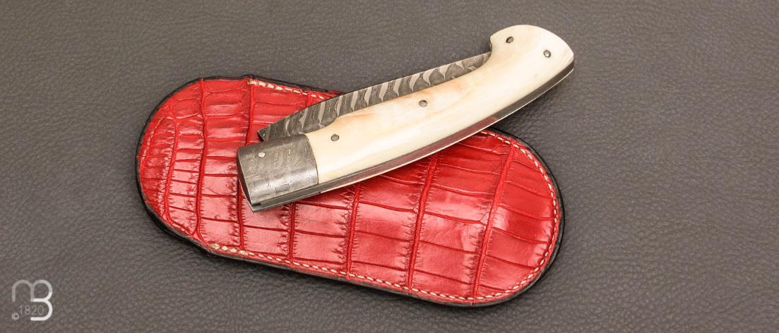 Couteau de poche lame damas multi-barreaux - Cran forcé - plaquettes en ivoire de phacochère