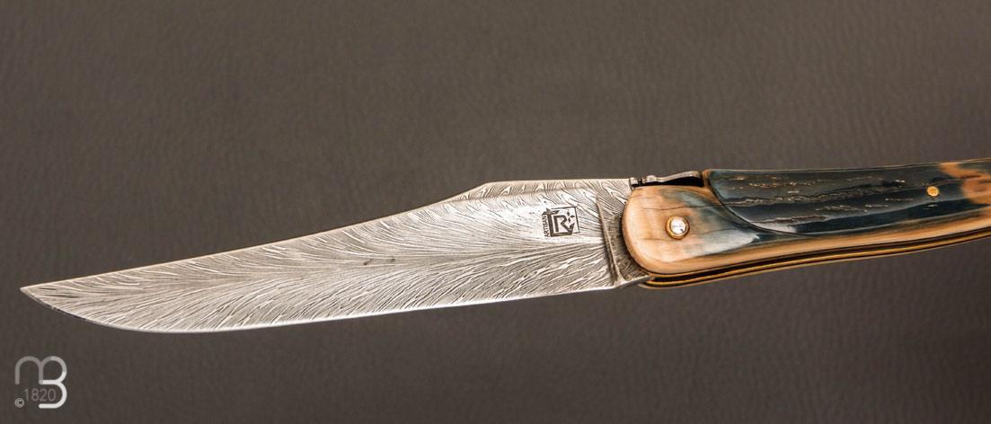 Couteau " Laguiole Queue de Scorpion " 13 cm par Rozelier Fabien - Ty Coutelier - Damas plume et ivoire de mammouth