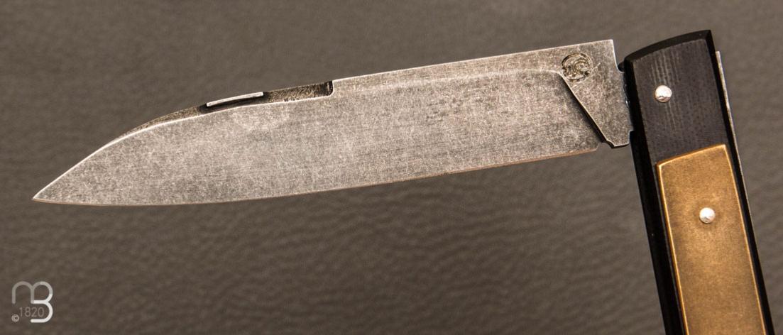 Manche composé de plaquettes en G10 noir et laiton patiné.
