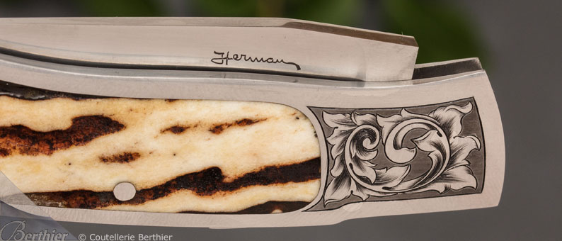 Manche en acier inoxydable 416, plaquettes en bois de cerf, gravure de Tim Herman.