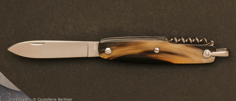 Couteau régional de poche Mongin Canif, pliant à cran forcé, avec tire-bouchon. Manche en corne blonde avec bélière. Longueur manche 100 mm. Longueur lame 80 mm, en inox, finition (poli-miroir).