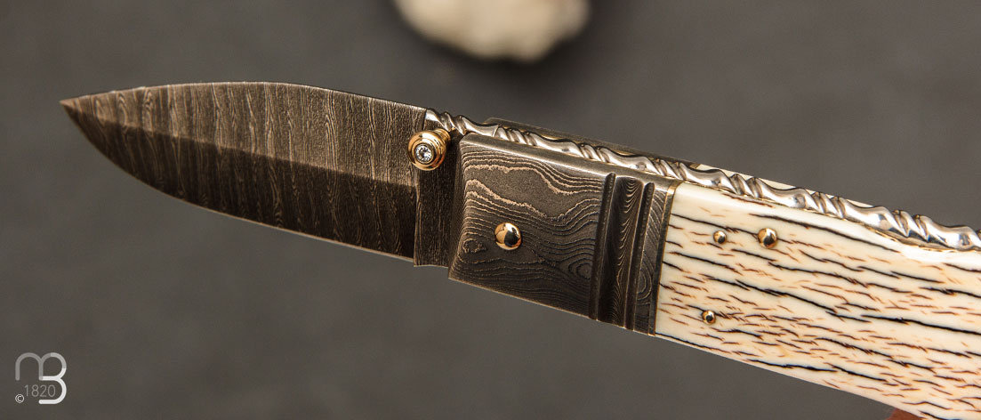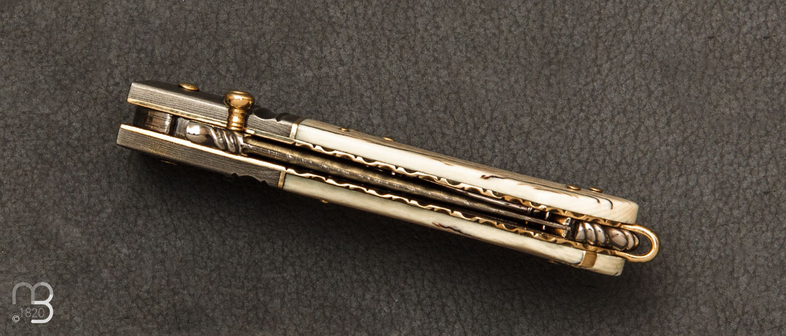 Mitres en acier damas carbone, plaquettes en ivoire de mammouth, rivets en or 18 carats.