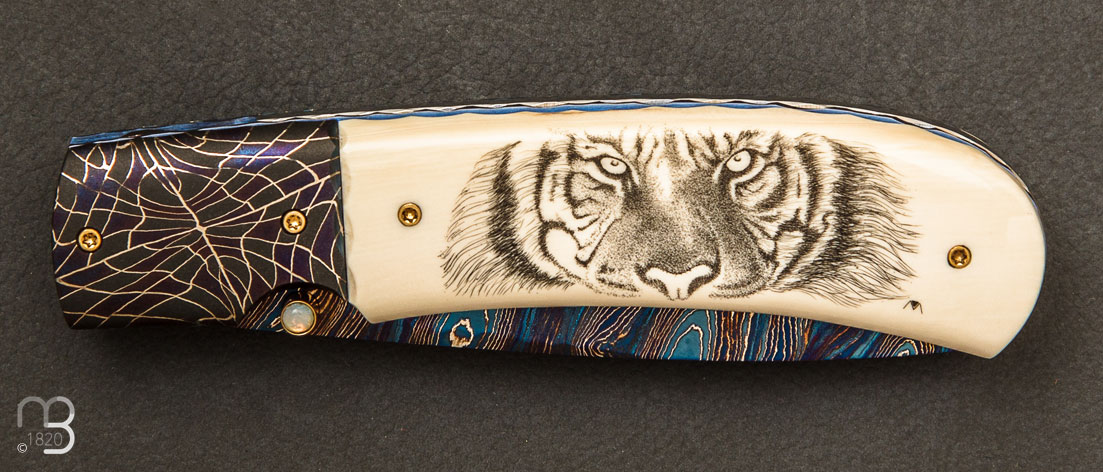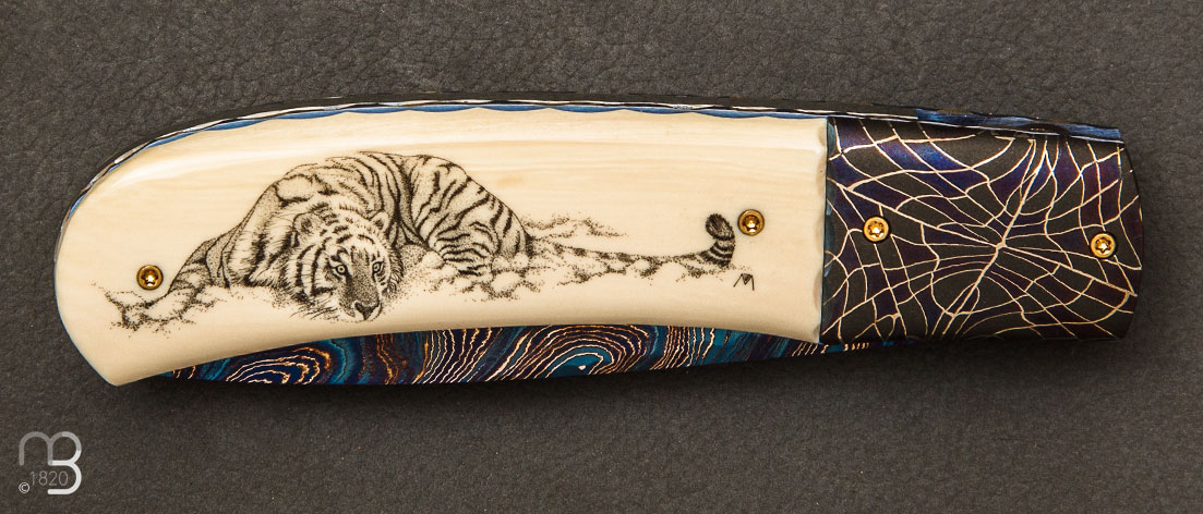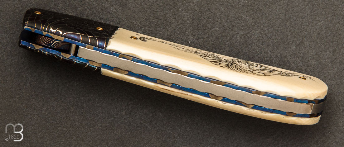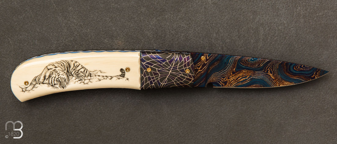 • Couteau de poche scrimshaw et damas par Francesco Pachi