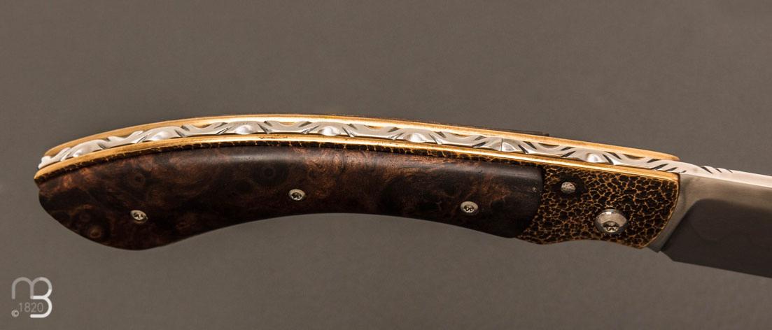 Manche composé de plaquettes en loupe de noyer stabilisées, vissées sur platines en laiton martelées.
