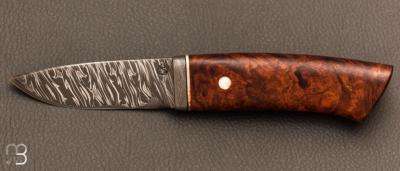 Un morceau de bois de fer très noueux allié à un damas au motif très fin font de ce couteau de Jean-Paul Sire une œuvre d'art.