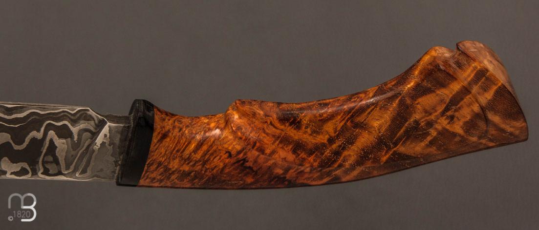 Un très beau couteau droit forgé de la main de Nicolas Mestrallet, avec lame en acier carbone damas et manche en loupe d'amboine