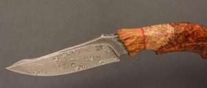 Un très beau couteau droit forgé de la main de Nicolas Mestrallet, avec lame en acier carbone damas et manche en loupe d'amboine